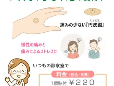 豊島医院 TOYOSHIMAIIN 当院について 診療案内 内科診療について 漢方内科診療について 小児科診療について 往 診 医師・スタッフ紹介 お知らせ COVID-19について コラム 採用情報 お問い合わせ HOME 2025年11月の記事 2025年11月の記事 【貼るタイプの鍼「円皮鍼」による鍼治療のご案内】 2025年11月1日 お知らせ NEW! 令和7年-8年 年末年始の診療について 2025年11月1日 お知らせ NEW!